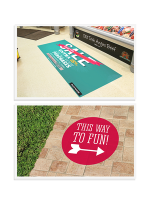 Custom floor graphics can be produced in a variety of shapes & sizes, they will adhere to any smooth, clean surface & are easy to install & remove, there are many promotional advantages over other point of sale products, whether it’s a supermarket or an exhibition floor, floor graphics have a unique eye catching presence. All floor graphics are printed in high quality on to removable vinyl with an anti-slip floor laminate. With options available for use indoors and out we can produce any design and shape you like.